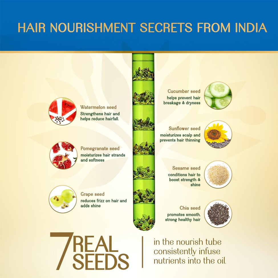 التركيبة فيها إكليل الجبل المعروف بقدرته على تنشيط الدورة الدموية في فروة الرأس، وده بيحفز البصيلات ويقلل التساقط. ومعاه مزيج من ٧ بذور طبيعية زي الحلبة، السمسم، الكتان، الخردل، الجرجير، دوار الشمس، والقرع، كل واحدة فيهم ليها دور في تقوية الشعر، ترطيبه، وزيادة لمعانه. الزيت خالي من السيليكون والبارابين، وده يخليه مناسب لكل أنواع الشعر، حتى الحساس.
