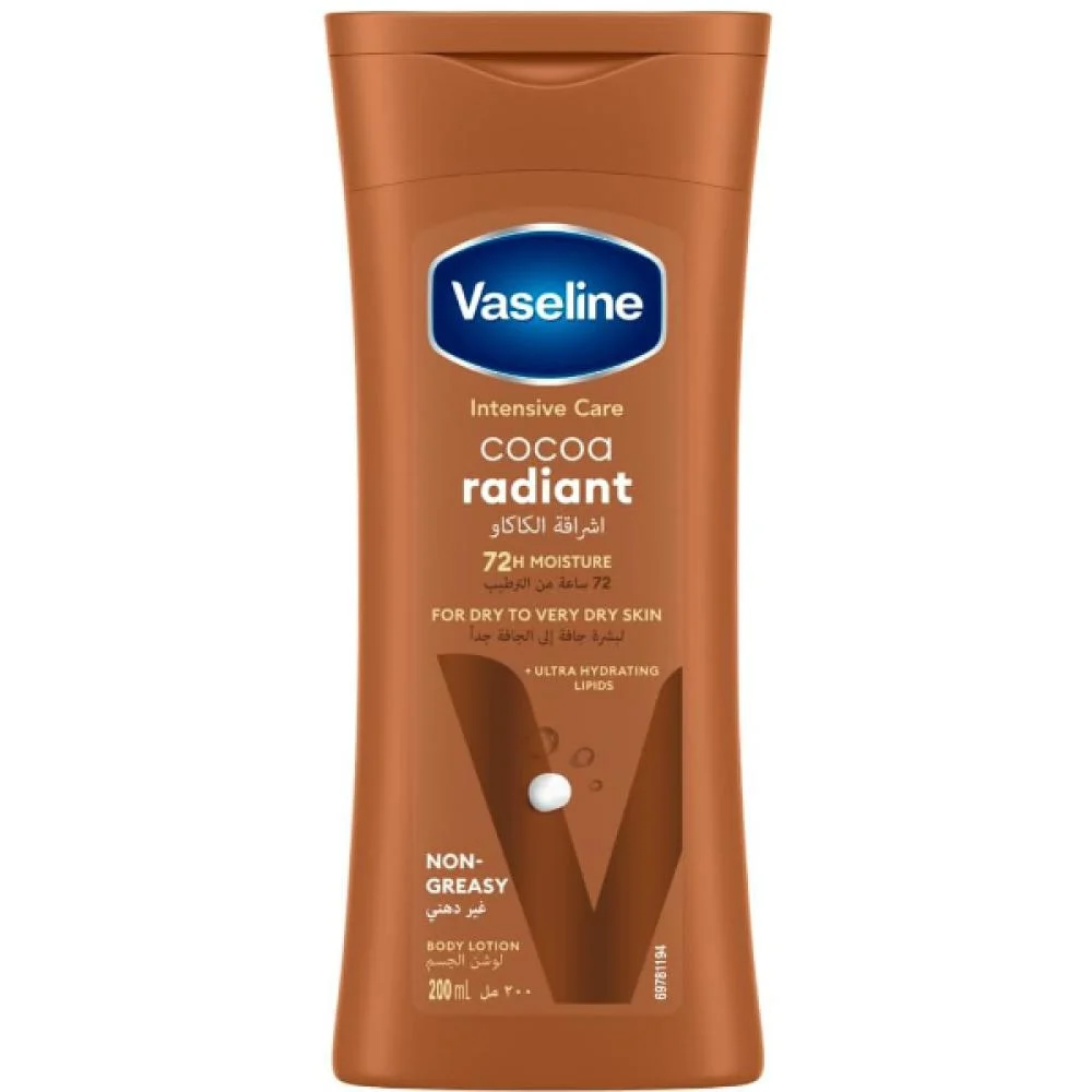فازلين لوشن للعناية المركزة بالكاكاو اللامع – غير دهني 200 مل: إشراقة طبيعية وترطيب عميق من غير ملمس مزعج Vaseline Intensive Care Cocoa Radiant Lotion – Non-Greasy 200 ml
