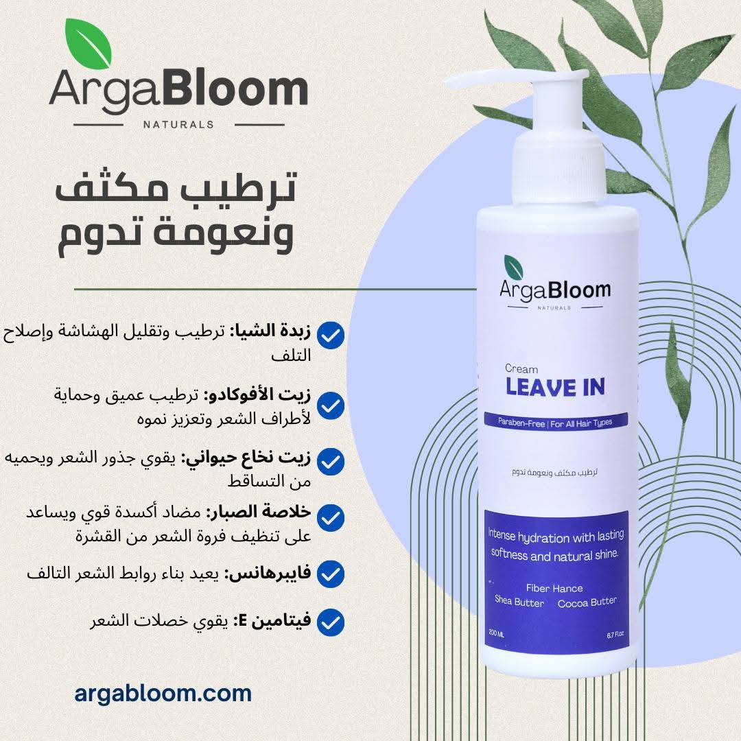 ليف إن رجابلوم ٢٠٠مل فري سلفات بزيت الأرجان والألوفيرا Arga Bloom Naturals Cream Leave IN 200ml: الحل العملي لشعر ناعم، مرطب، وسهل التسريح طول اليوم