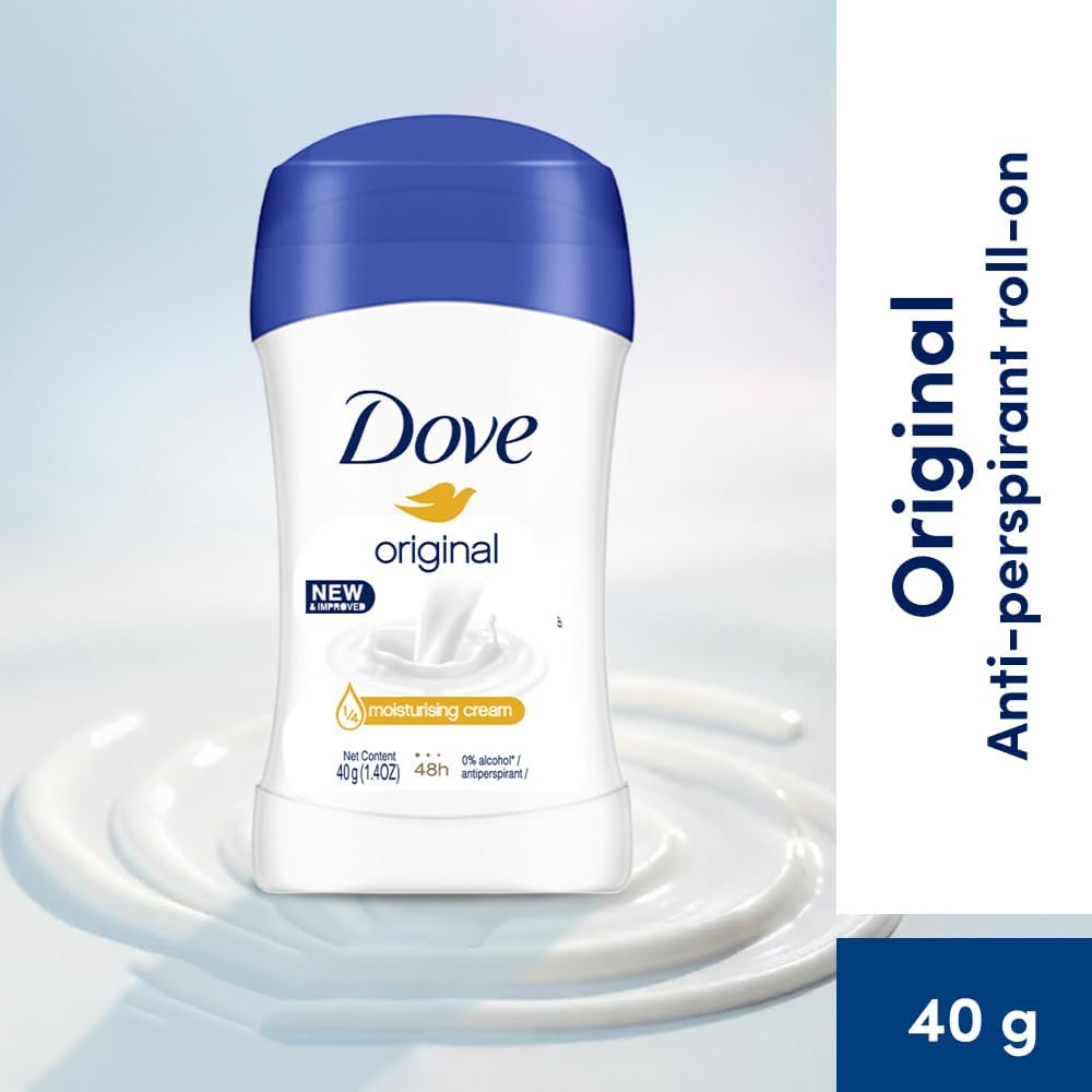 دوف ستيك ٤٠جم أوريجنال موستريزينجDove Original Stick Deodorant 40 g مزيل عرق ناعم للبشرة الحساسة، فيه ¼ كريم مرطب بيهدي الجلد بعد الحلاقة. يحمي من العرق والريحة لمدة ٤٨ ساعة، من غير ما يسيب أثر على الهدوم. ريحته هادية ونظيفة، وحجمه عملي يناسب شنطتك.