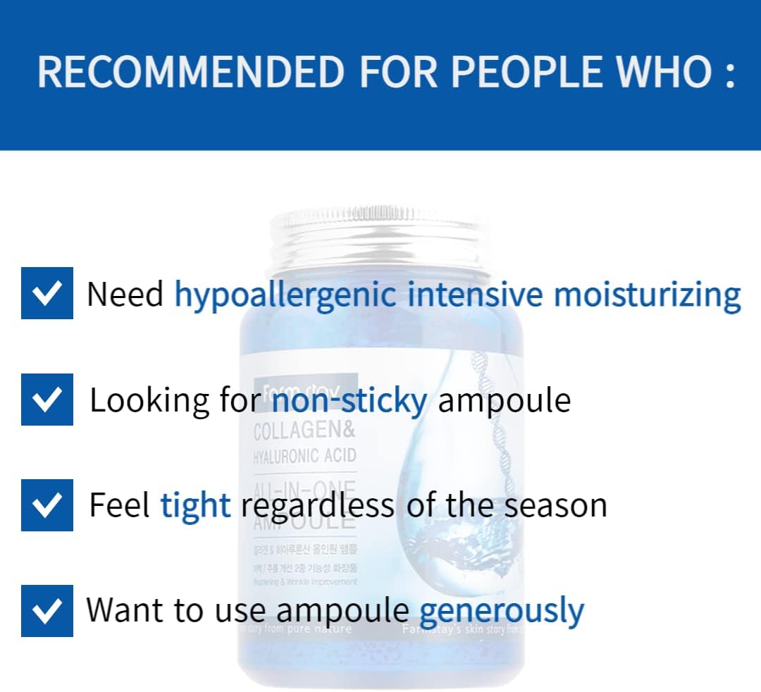 مميزات فارم ستاي كولاجين + هيالورونيك برطمان ٢٥٠مل FARM STAY Collagen and Hyaluronic Acid All In One Ampoule 250ML