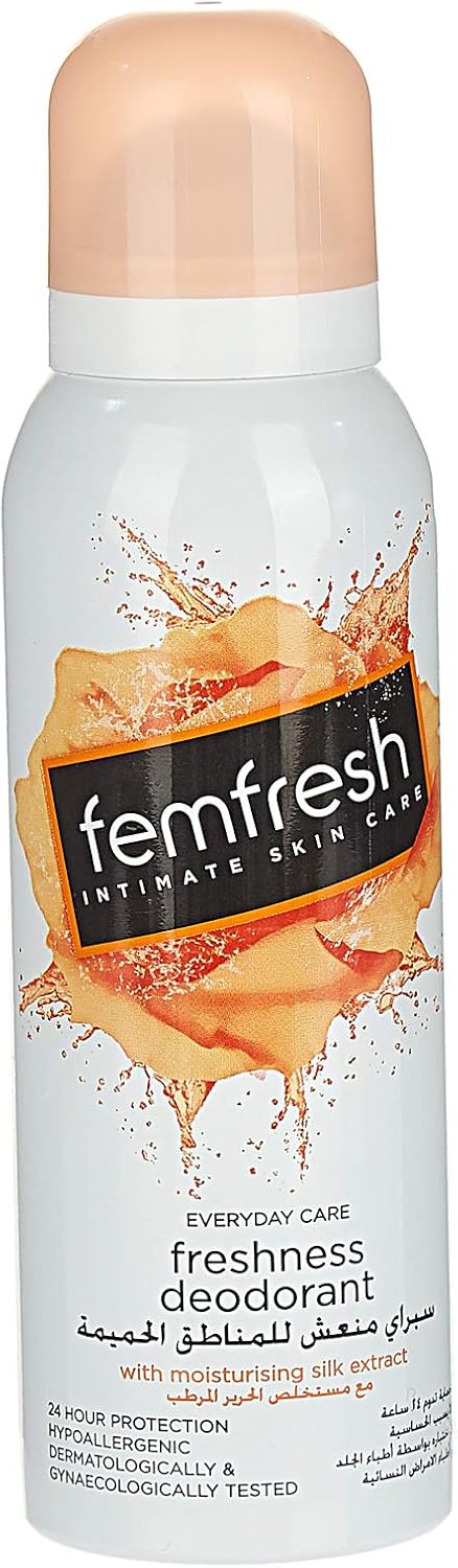 فيم فريش سبراي مزيل لرائحة العرق للمناطق الحساسة Femfresh Deodorant Intimate Spray Freshness 125 ml هو رذاذ منعش معطر يمنحك انتعاشًا يدوم 24 ساعة تم تركيبه خصيصًا للاستخدام الأنثوي الحميم. يُزيل الروائح الكريهة ويضفي رائحة خفيفة ومنعشة بفضل مكوناته الطبيعية كالبابونج ومستخلص الحرير، ومُختبر من قبل أطباء الجلدية للاستخدام اليومي بأمان.كما انه لطيفة وآمنة للبشرة الحساسة