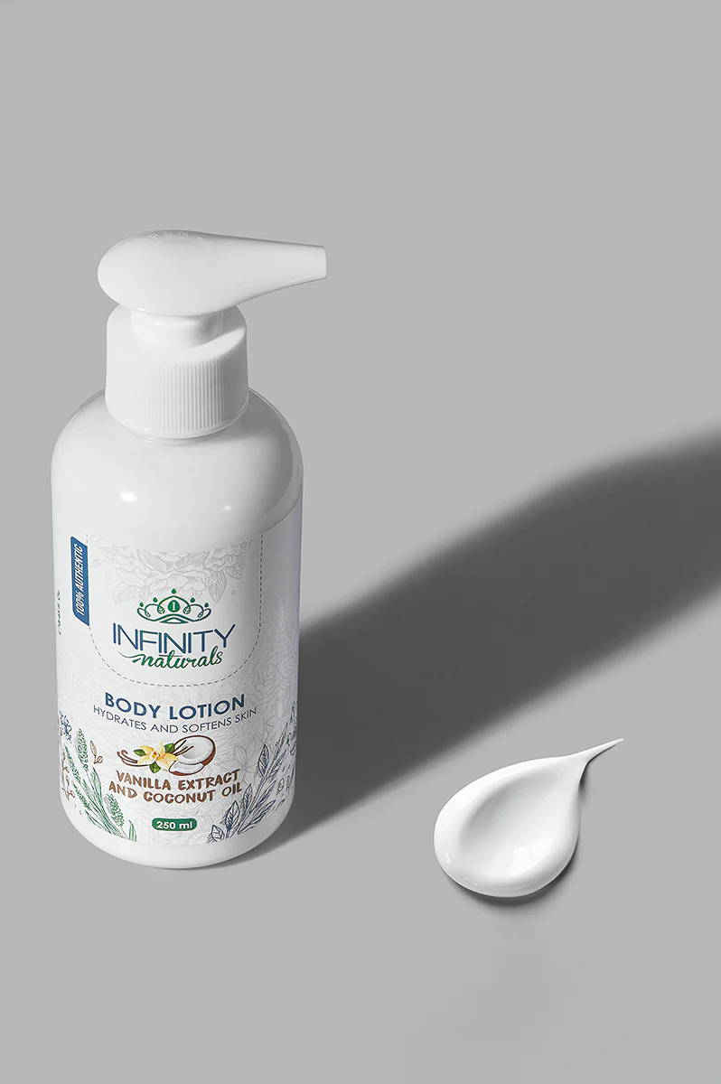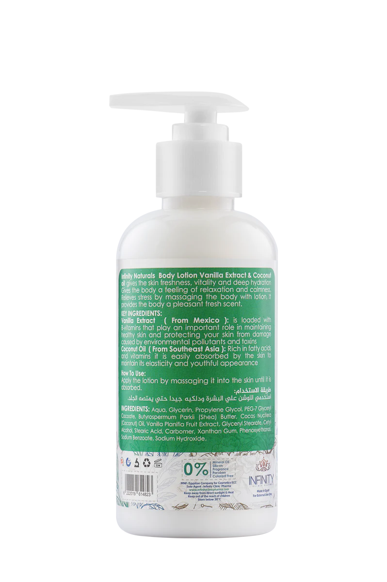 انفینیتي ناتشورال بادي لوشن جوز الهند والفانيليا ٢٥٠مل Infinity Naturals Body Lotion with Vanilla Extract and Coconut Oil – 250 ml: سر الترطيب الفاخر والراحة النفسية لبشرتك