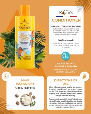 كارتييه بلسم بزبدة الشيا 400 مل Les Karites Shea Butter Deep Moisturizing Conditioner – 400ml – ترطيب فاخر ولمعان طبيعي لشعرك! بلسم غني بزبدة الشيا النقية، بيغذي الشعر بعمق، يفك التشابك، ويمنع التقصف. تركيبته خفيفة وآمنة، مناسبة للشعر الجاف والعادي وحتى المصبوغ.