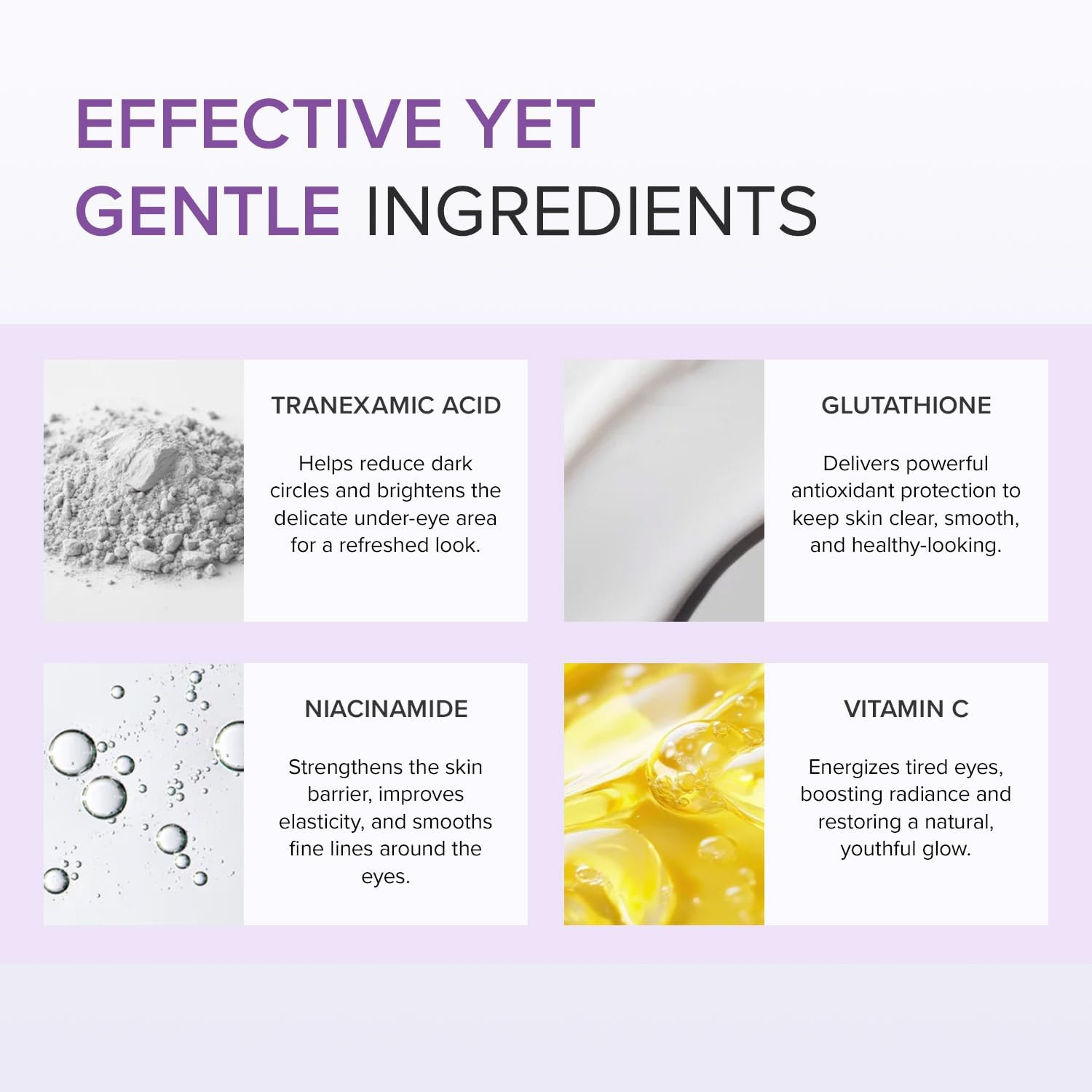 حمض الترانيكساميك بيشتغل على تقليل التصبغات اللي بتظهر تحت العين بسبب الإرهاق أو التعرض للشمس. بيمنع تكوّن الميلانين، وده بيخلي لون الجلد يوحد تدريجيًا مع الاستخدام المنتظم.