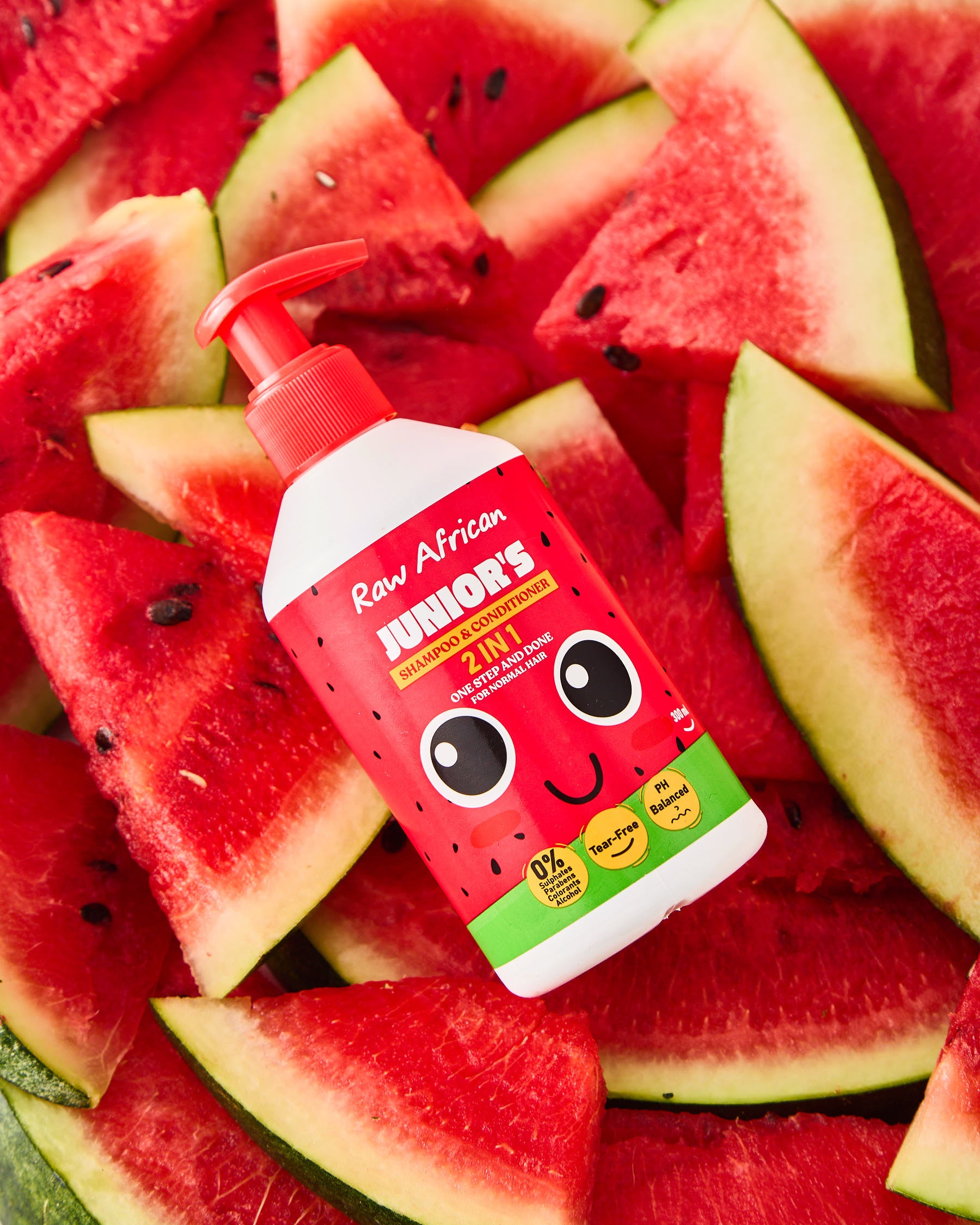 “شامبو وبلسم Raw African Juniors Shampoo And Conditioner 300 ml في خطوة واحدة، ينضف شعر طفلك بلطف، يرطبه، ويفك التشابك من غير دموع. بريحة بطيخ منعشة، ومناسب لكل أنواع الشعر حتى الكيرلي.”