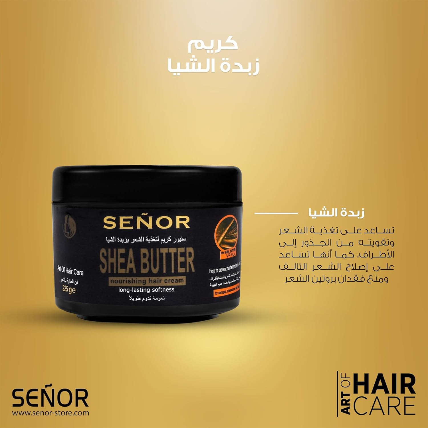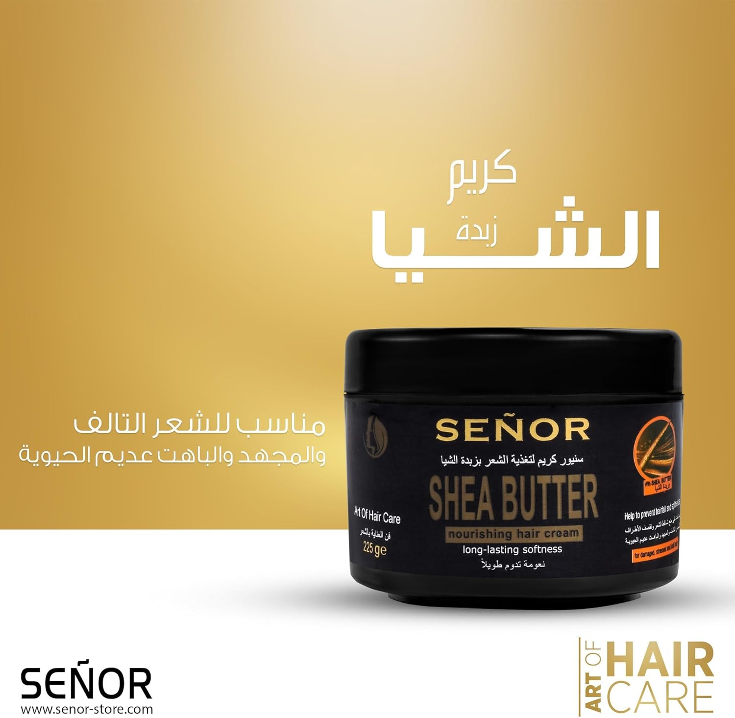 سنيور كريم بزبدة الشيا ٢٢٥جم senor Nourishing Shea Butter Creme 8.45 oz– ترطيب فوري ولمعان طبيعي! كريم مغذي للشعر الجاف والتالف، غني بزبدة الشيا وزيوت طبيعية، بيقوي الشعر من الجذور، وبيفك التشابك بسهولة.