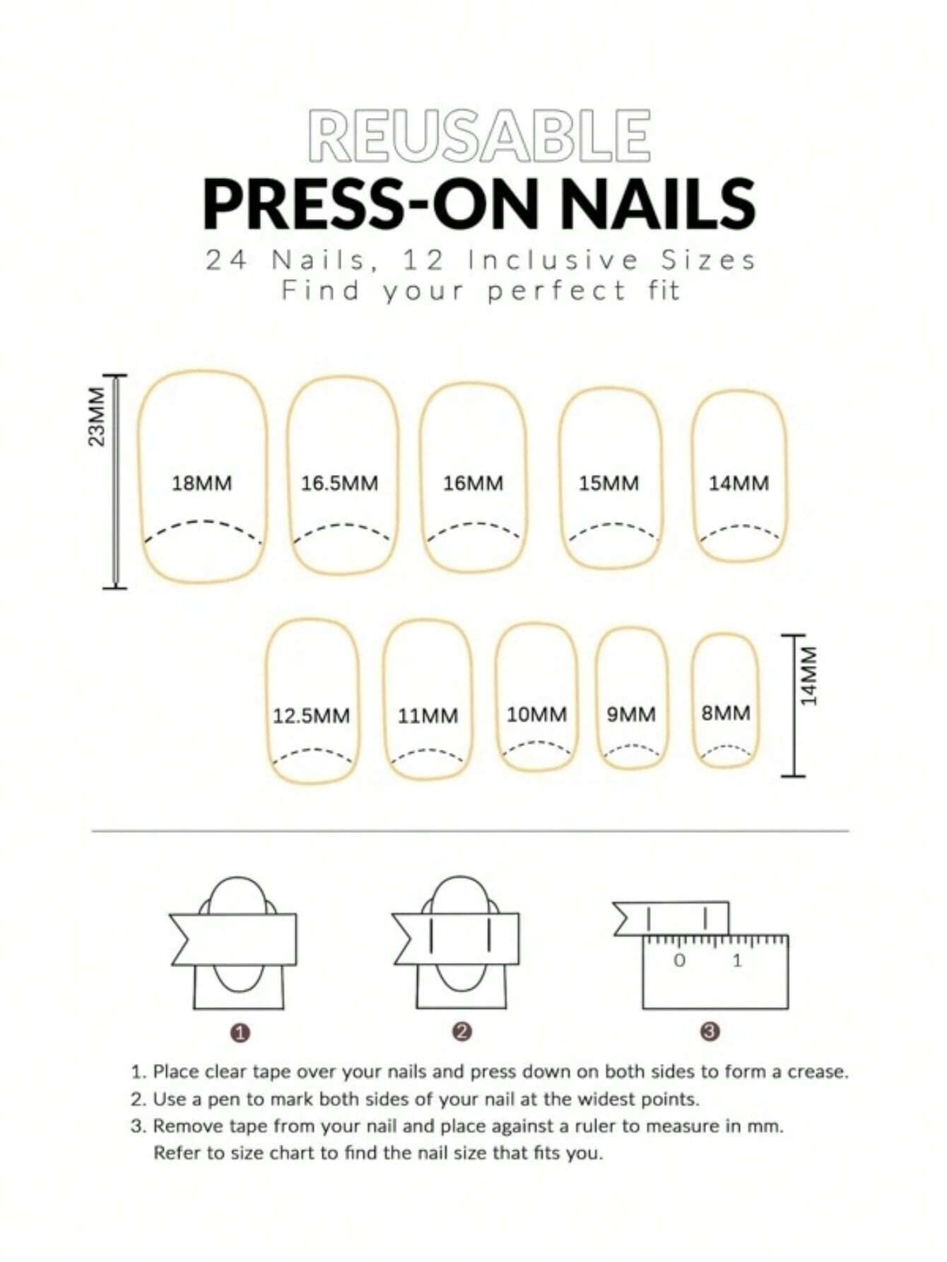 الطقم ده معمول مخصوص للبنات اللي بتحب اللوك الكلاسيكي البسيط. الشكل المربع بيخلي الأظافر تبان أنثوية ومرتبة، وبيضيف لمسة فخامة من غير أي مبالغة. العبوة فيها 24 قطعة، يعني تقدري تغطي كل أظافرك وتحتفظي بقطع إضافية للاستخدام مرة تانية. كمان سهل الاستخدام جدًا، تقدري تركبيه في دقائق من غير أي أدوات معقدة.