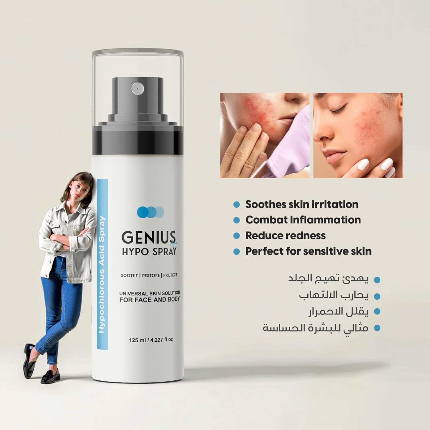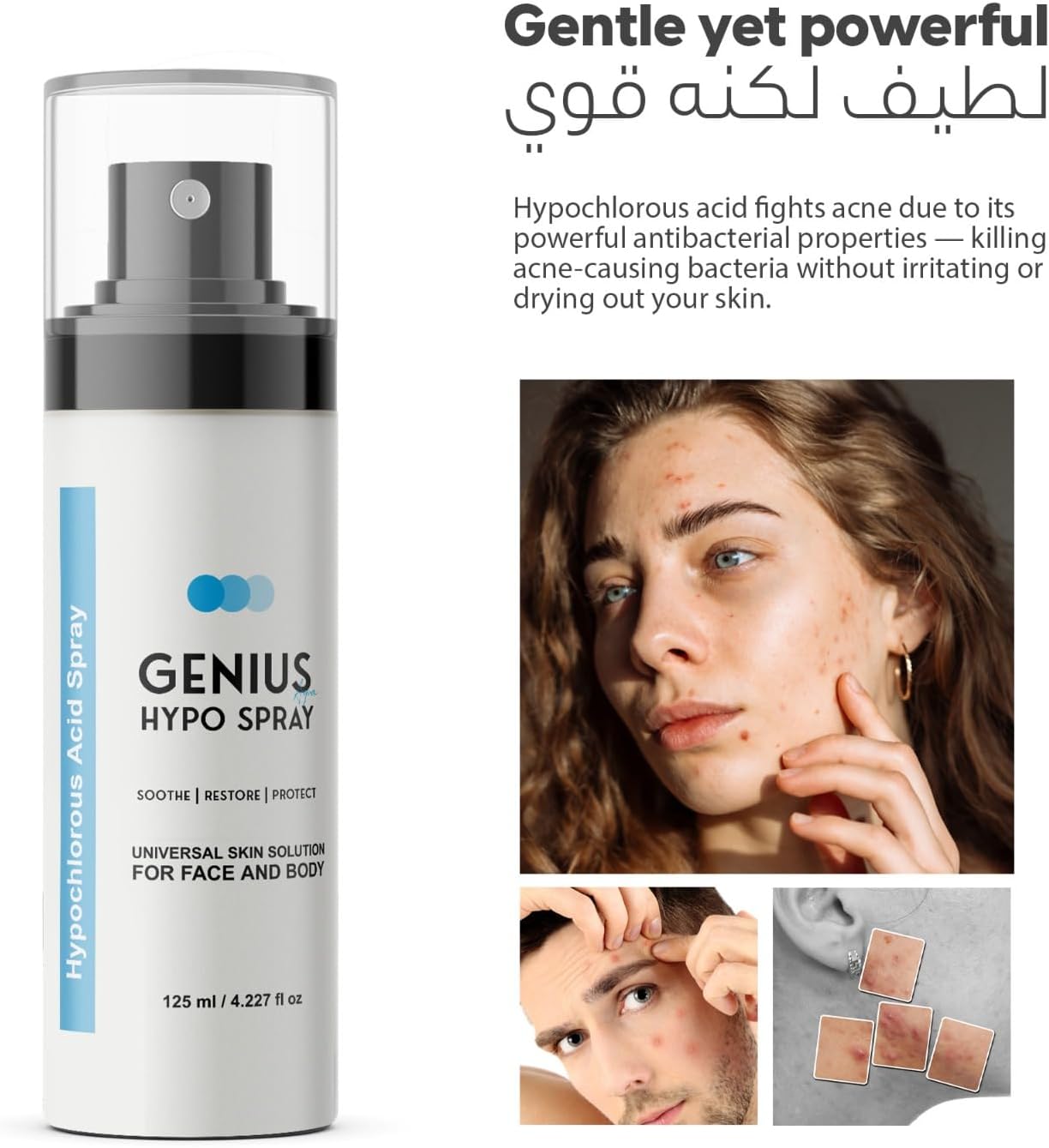 سبراي جينيوس هايبو ١٢٥مل بيحتوي على حمض الهيبوكلوروز، وده عنصر طبيعي الجسم بيستخدمه لمحاربة الالتهابات. لما يتحط على البشرة، بيشتغل كدرع واقي ضد البكتيريا والتهيج، وبيهدّي الاحمرار بشكل ملحوظ.
